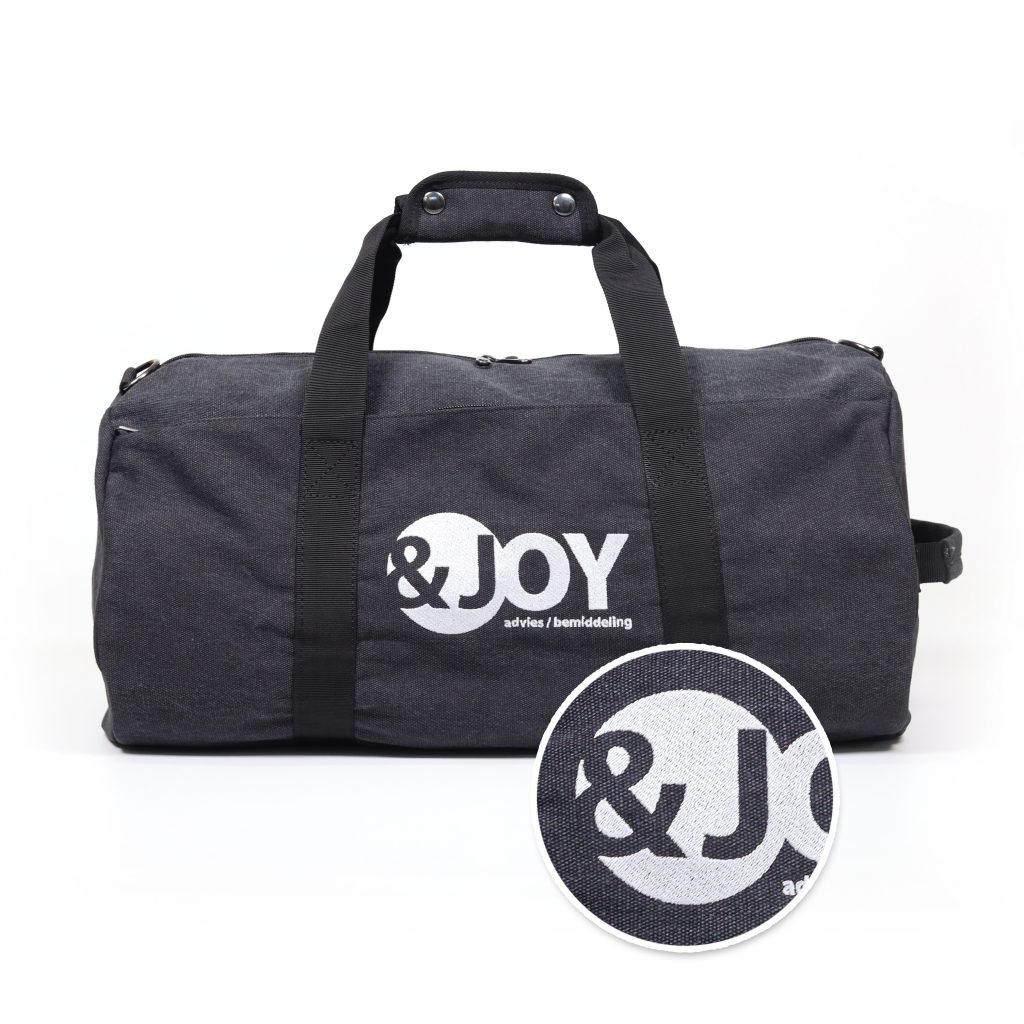 Het bedrijfslogo geborduurd op een reistas. Gevuld met leuks en lekkers uitgedeeld aan waardevolle relaties.